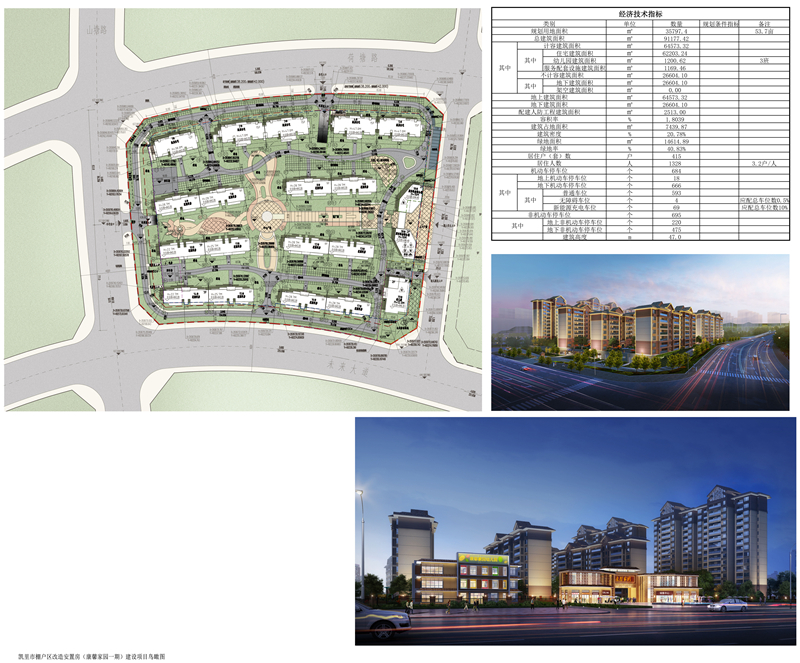 该规划设计方案于2020年10月16日经第十一次市城规委规划方案评审会议审查(凯市规委(2020)106号),修改后凯里市棚户区改造安置房(康馨家园一期)建设项目方案主要技术经济指标为:本项目总用地面积35797.4㎡,总建筑面积91177.42㎡,其中计容建筑面积64573.32㎡,不计容建筑面积26604.10㎡,容积率1.8039,建筑密度20.78%,绿地率40.83%,总户数415户,机动车停车位数684辆,非机动车位指标695辆。